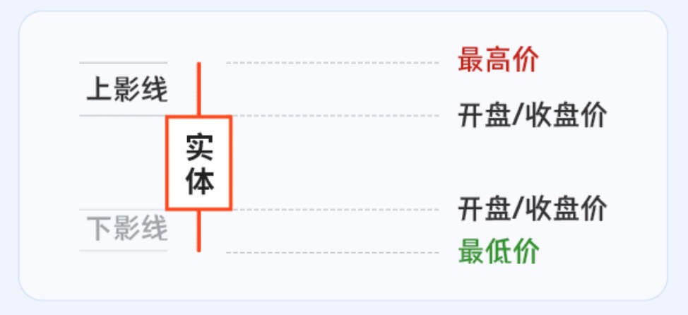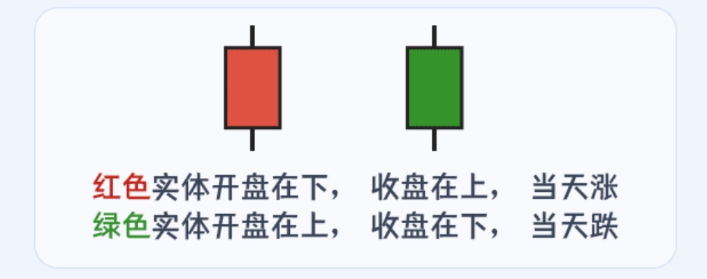 总之,红色实体开盘在下,收盘在上,当天涨;绿色实体开盘在上,收盘在下,当天跌。