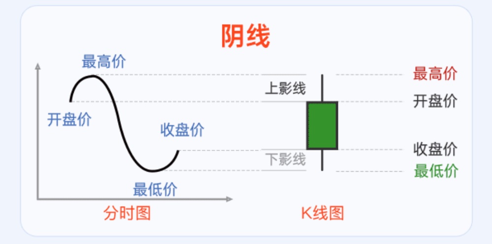 如果当日的价格是下跌的,开盘价高于收盘价,开盘价在上收盘价在下,那么这个实体就是绿色的我们称之为阴线;