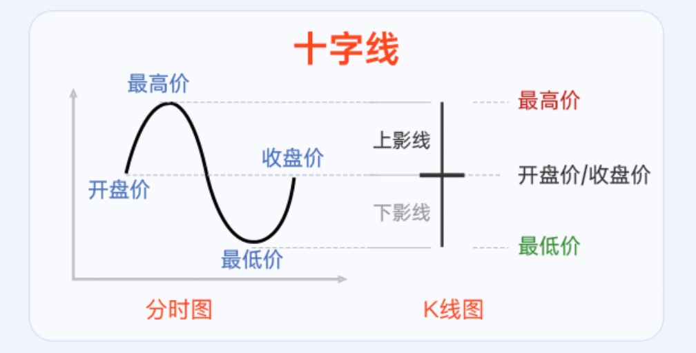 还有一种特殊的情况,就是开盘价和收盘价是相同的我们称之为十字线。