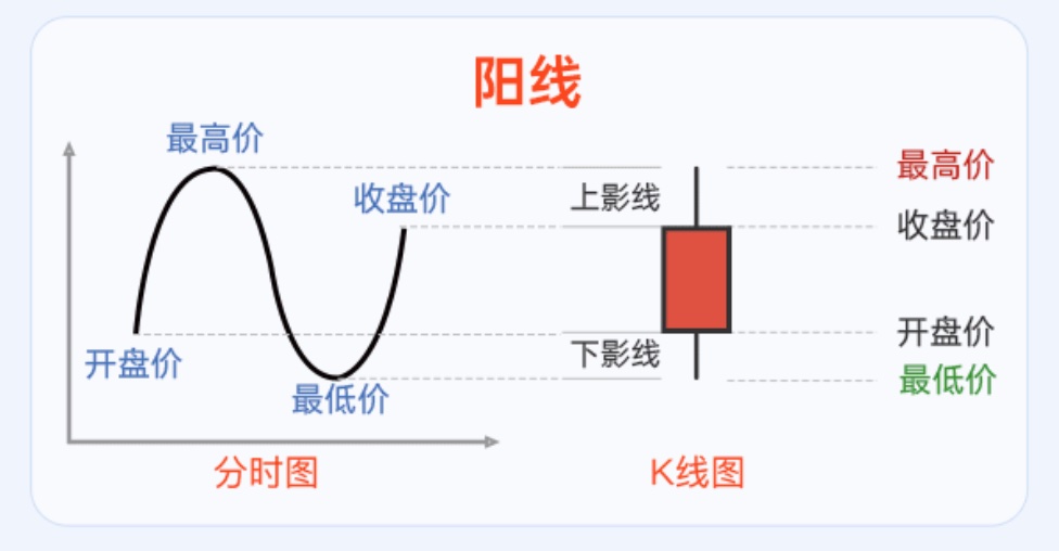 那为什么会有红绿之分呢?如果当日的价格是上涨的,开盘价低于收盘价,开盘价在下收盘价在上,那么这个实体就是红色我们称之为阳线,用分时图表现就是这个样子;